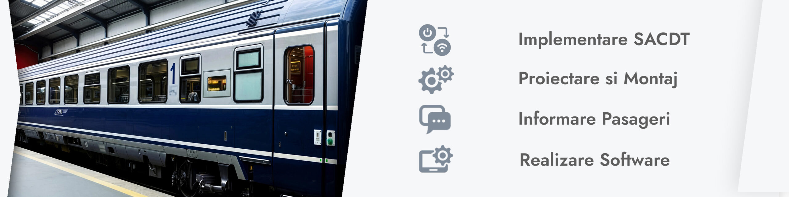 - Proiectare, executie si montaj pentru: instalatia electrica a vagonului; tablou electric cu sistem automat de comanda si diagnoza; afisoare pentru informare pasageri; sistem de transmisie date tren-sol WLAN si GPS; sursa de incarcare baterii de acumulatori.