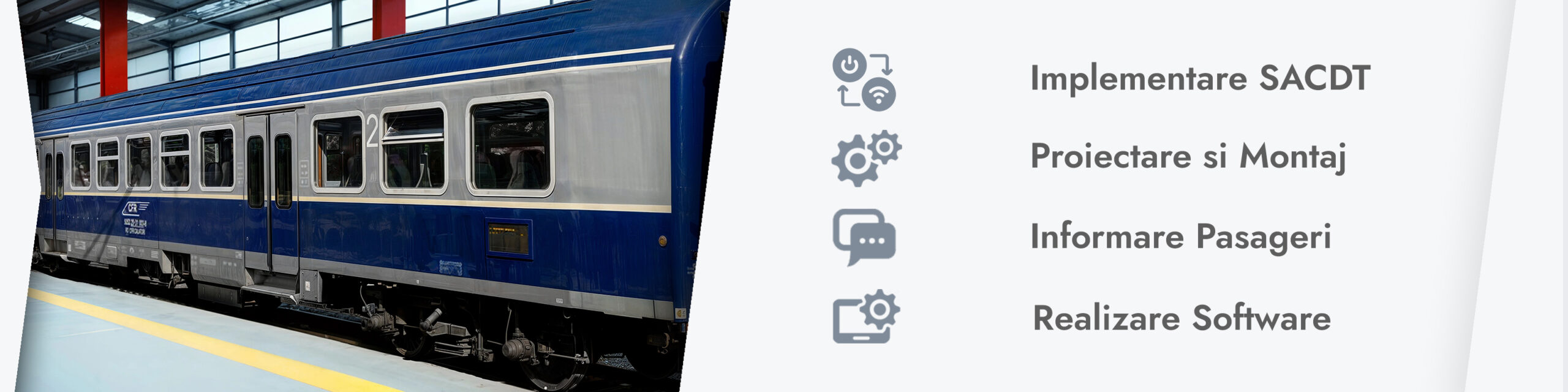 - Proiectare, executie si montaj pentru: instalatia electrica a vagonului; tablou electric cu sistem automat de comanda si diagnoza; afisoare pentru informare pasageri; sursa de incarcare baterii de acumulatori; sistem de comanda a usilor de intercomunicatie si diferite subansamble pentru conectarea acestora in instalatia vagonului (cutii de sigurante, doze etc).